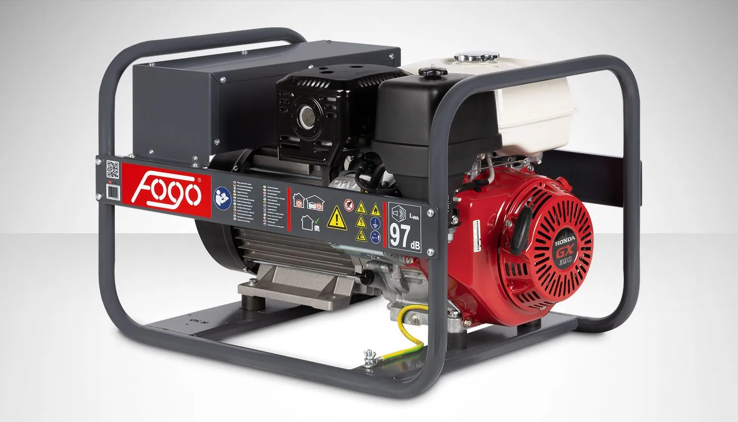 Agregat prądotwórczy 1-fazowy FOGO FH7541 (IP54) — moc 6,2/5,6 kW, silnik HONDA GX390, zbiornik 6,1 l, masa 97 kg. Stopień ochrony IP54 — odporność na zachlapanie i pył.