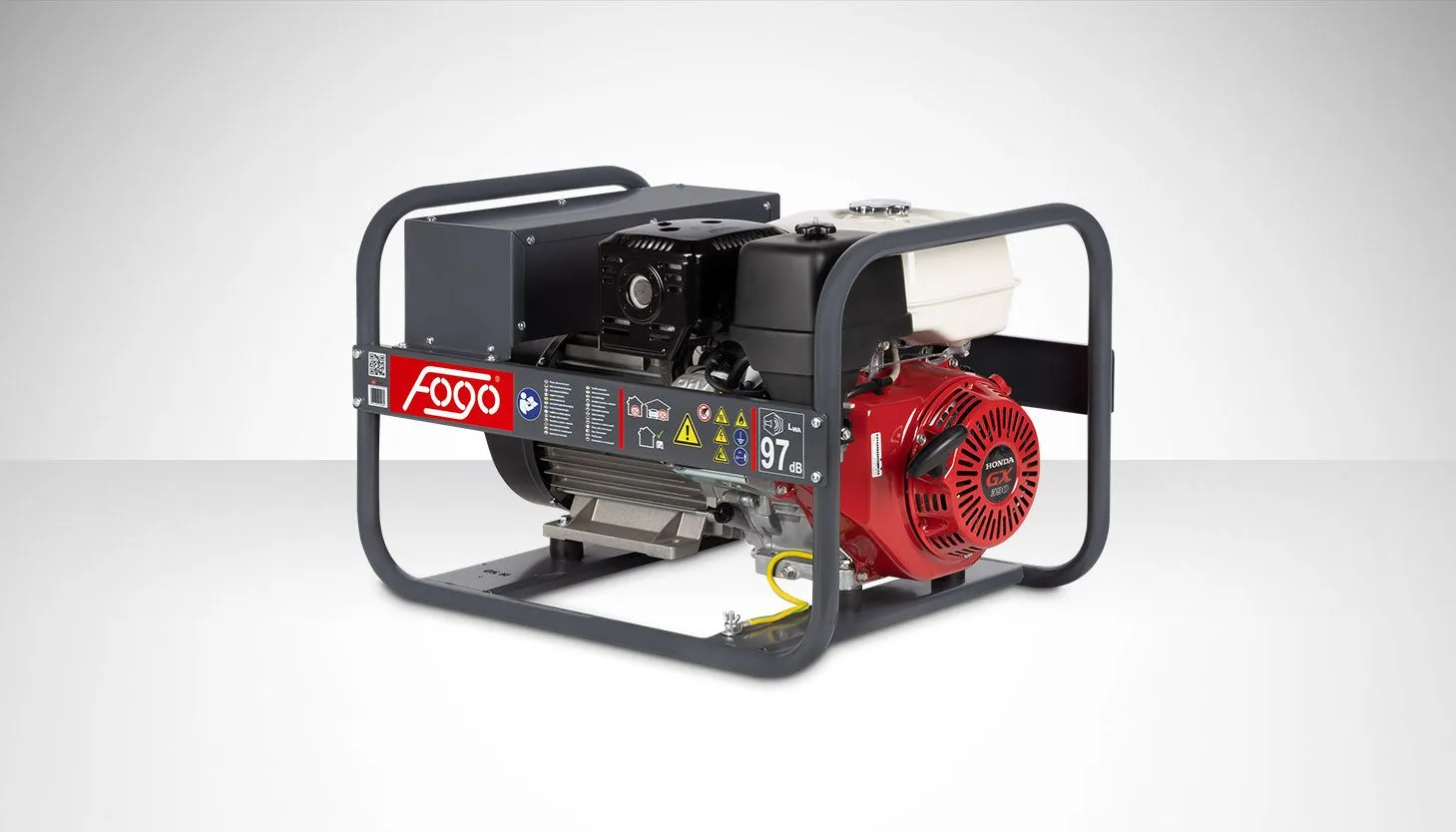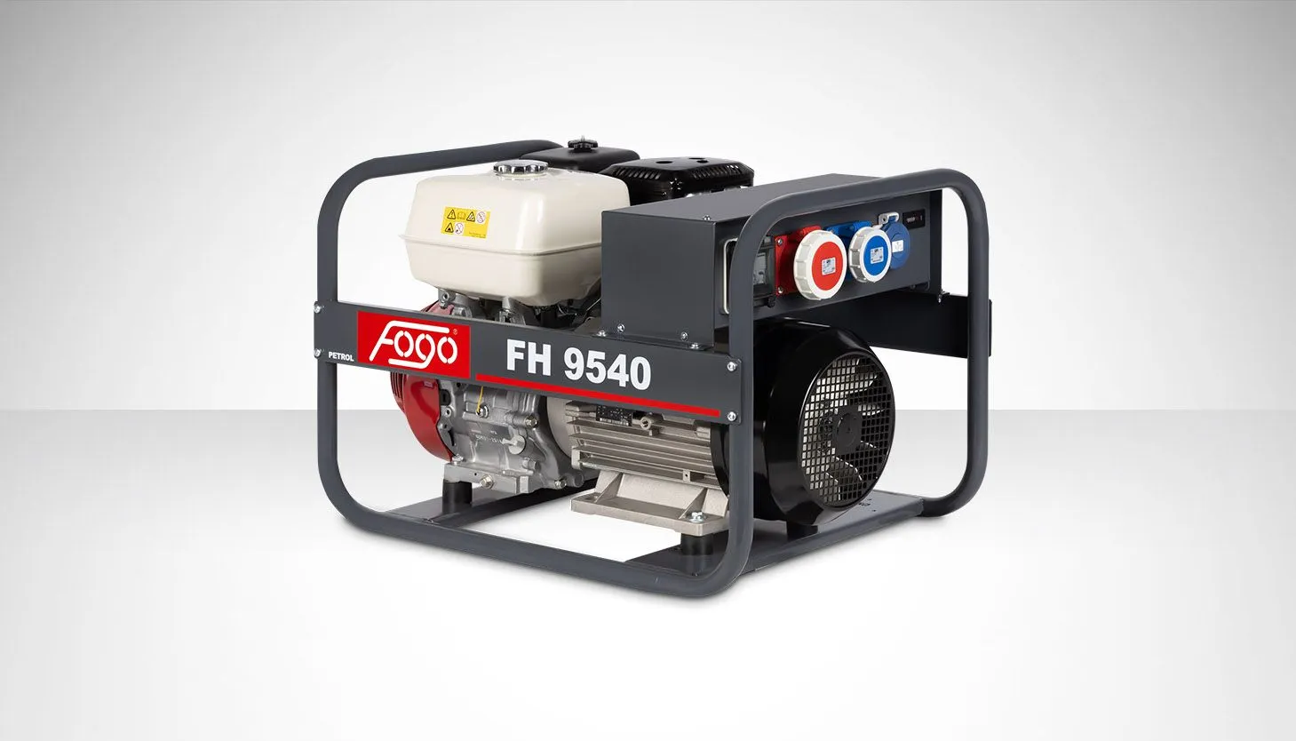 Agregat prądotwórczy 3-fazowy FOGO FH9540 (IP54) — moc 8,1/7,3 kVA, silnik HONDA GX390, zbiornik 6,1 l, masa 97 kg. Trójfazowy 400 V do urządzeń przemysłowych.