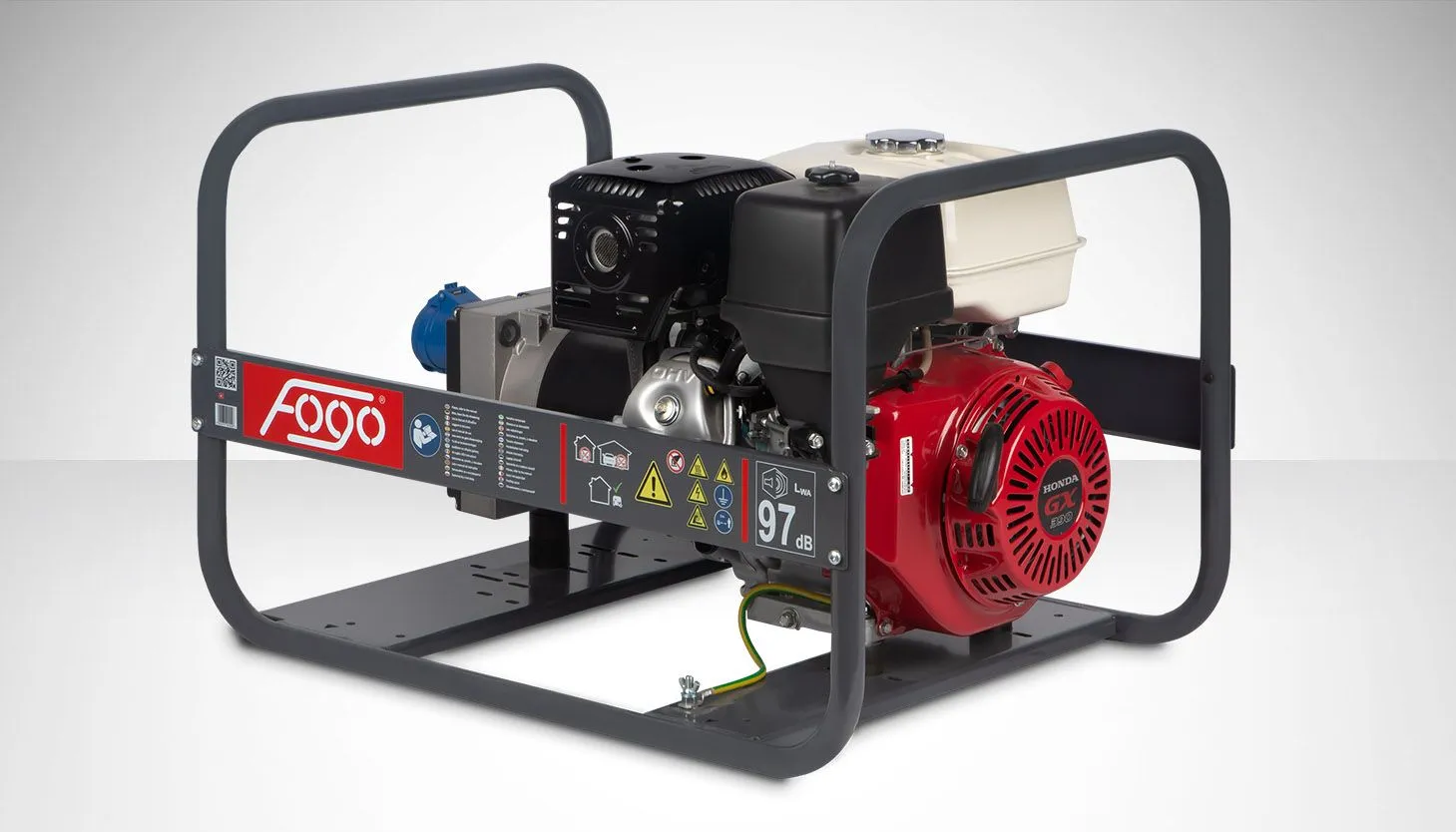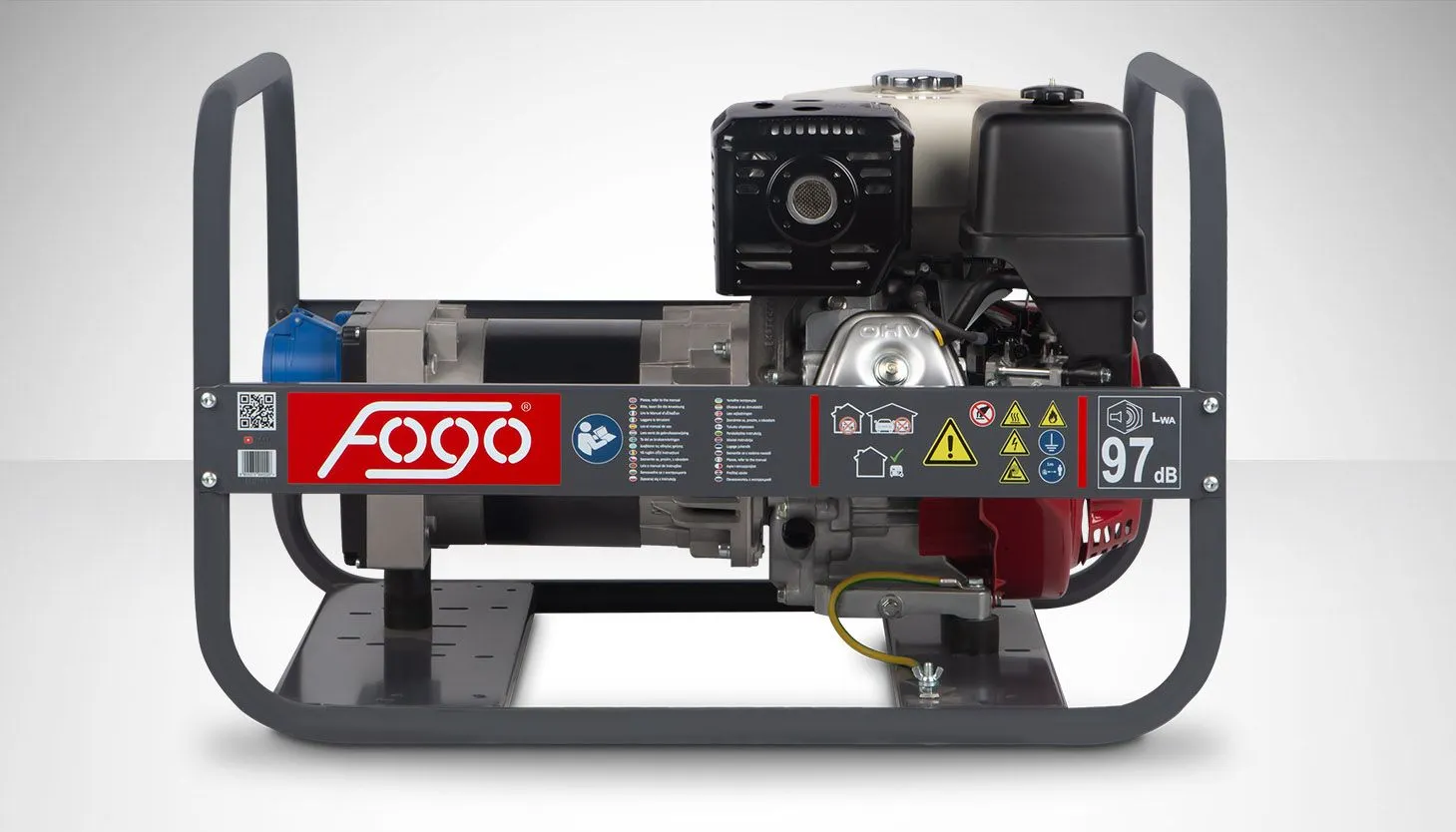 Agregat prądotwórczy jednofazowy FOGO FH7001 — moc 6,2 / 5,6 kW, silnik HONDA GX 390, zbiornik 6,1 l, masa 69 kg. Jednofazowy 230 V do narzędzi budowlanych i AGD.