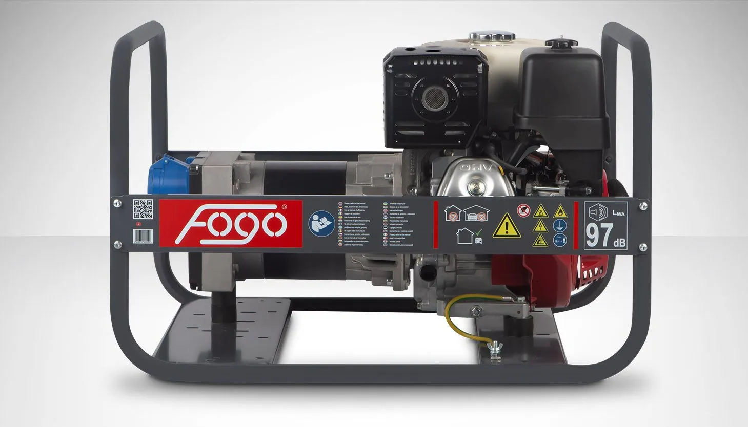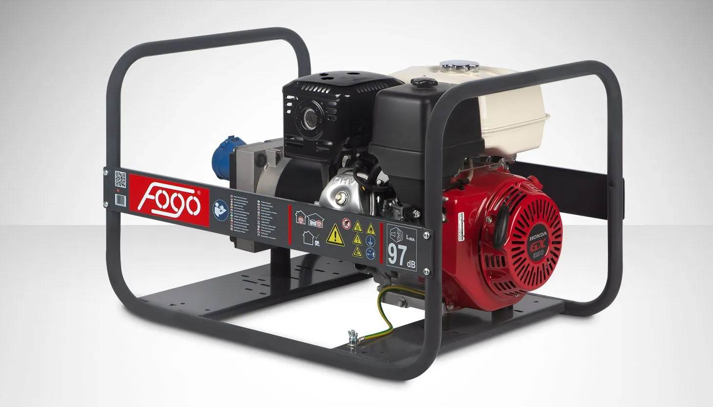 Agregat prądotwórczy jednofazowy FOGO FH7001R — moc 6,2 / 5,6 kW, silnik HONDA GX 390, zbiornik 6,1 l, masa 69 kg. Jednofazowy 230 V do narzędzi budowlanych i AGD.