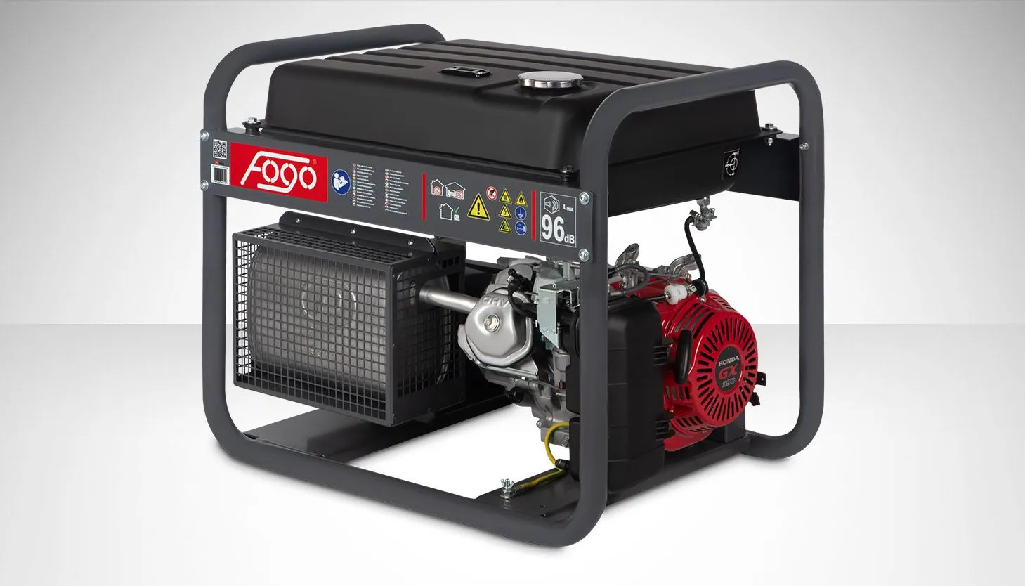 Agregat prądotwórczy jednofazowy FOGO FH7001TE — moc 6,2 / 5,6 kW, silnik HONDA GX 390, zbiornik 45 l, masa 96 kg. Jednofazowy 230 V do narzędzi budowlanych i AGD.